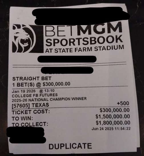 Official BetMGM ticket showing a bettor’s $300k wager on the Texas Longhorns to be the 2025-26 national champions (via BetMGM)