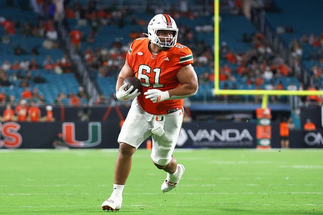 Francis Mauigoa #61 of the Miami Hurricanes carries the ball for a touchdown against the Syracuse Orange during the fourth quarter of the game at Hard Rock Stadium on November 08, 2025 in Miami Gardens, Florida. (Photo by Megan Briggs/Getty Images)