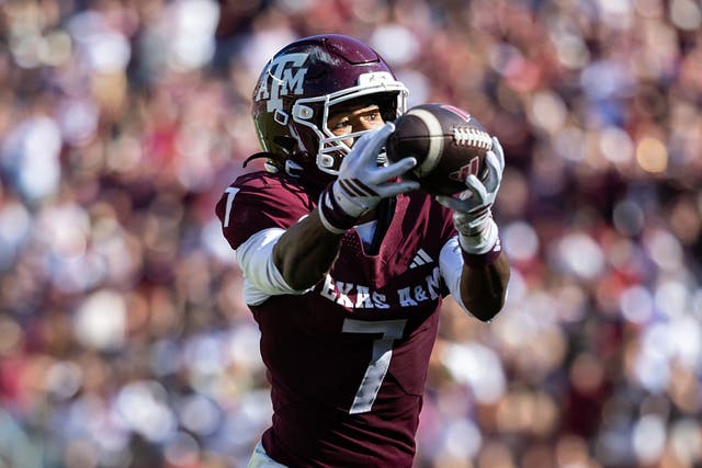 KC Concepcion #7 of the Texas A&M Aggies catches a pass in the second half of a game against the South Carolina Gamecocks at Kyle Field on November 15, 2025 in College Station, Texas. (Photo by Joe Buvid/ISI Photos/ISI Photos via Getty Images)