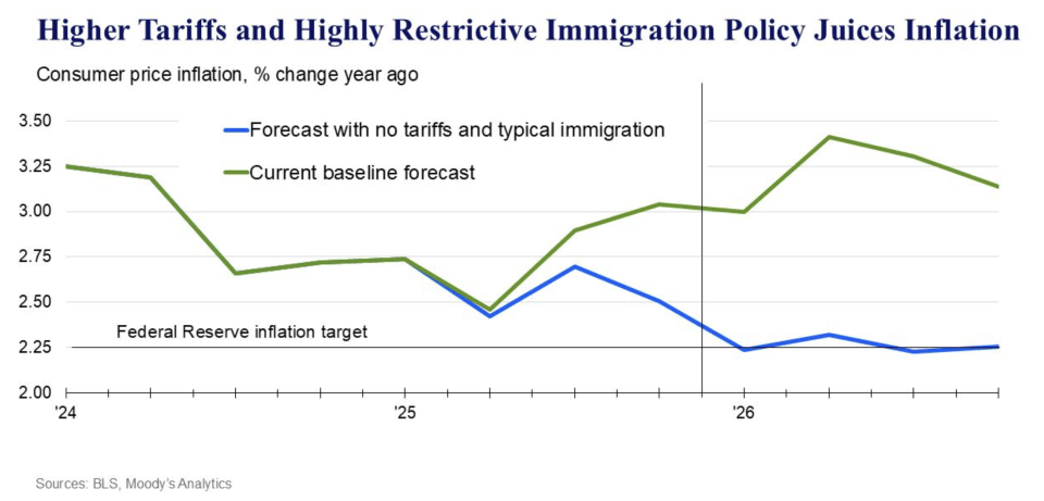 Against this, an alternate state of affairs with out Trump’s tariffs and beneath regular immigration circumstances would ship inflation hovering round 2.25% by means of 2026.