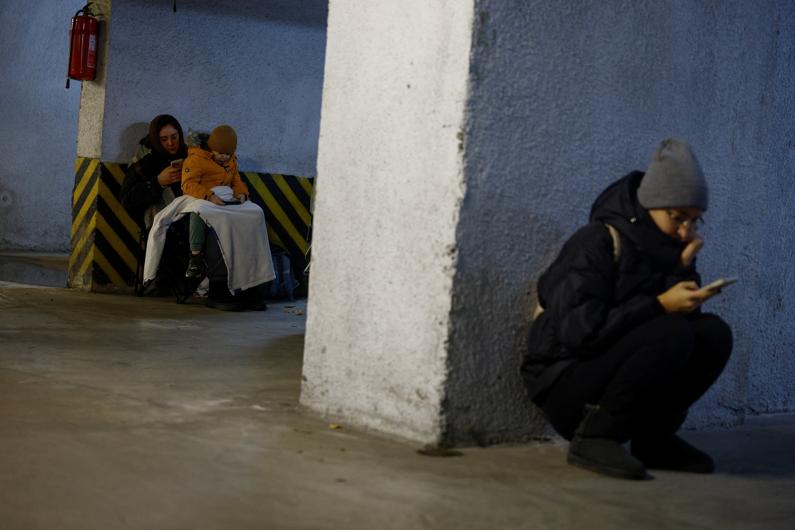 Individuals take shelter inside an underground parking zone throughout Russian missile and drone strikes, amid Russia’s assault on Ukraine, in Kyiv, Ukraine November 25, 2025.