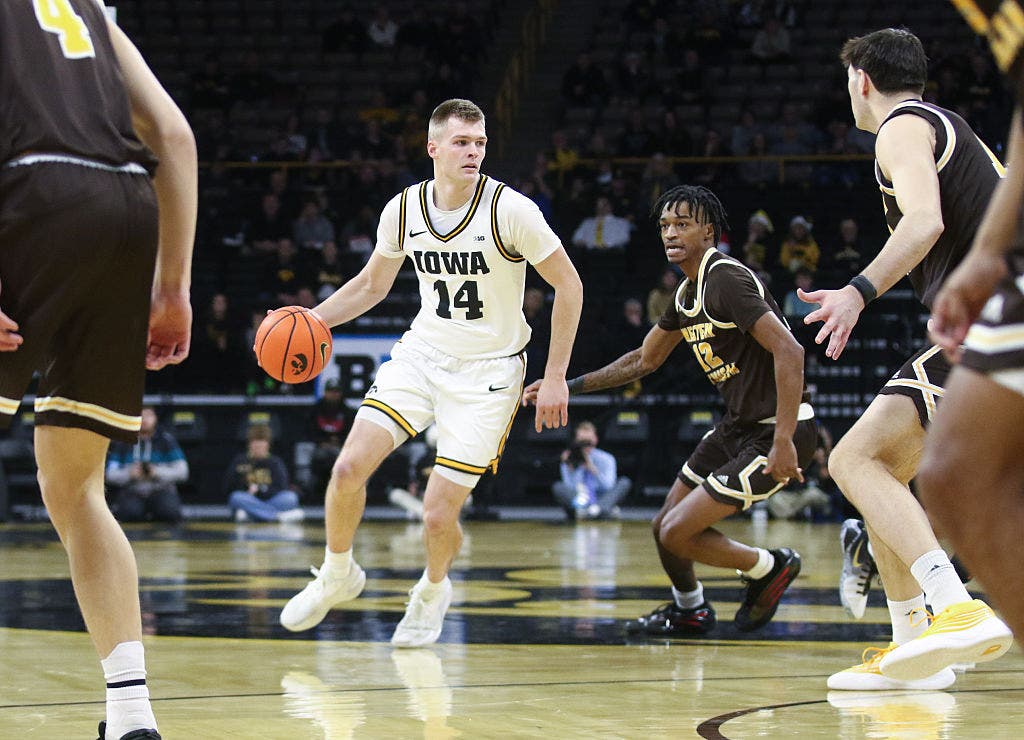 Iowa guard Bennett Stirtz goes to the basket against Jayden Brewer of the Western Michigan Broncos. (Photo by Matthew Holst/Getty Images)