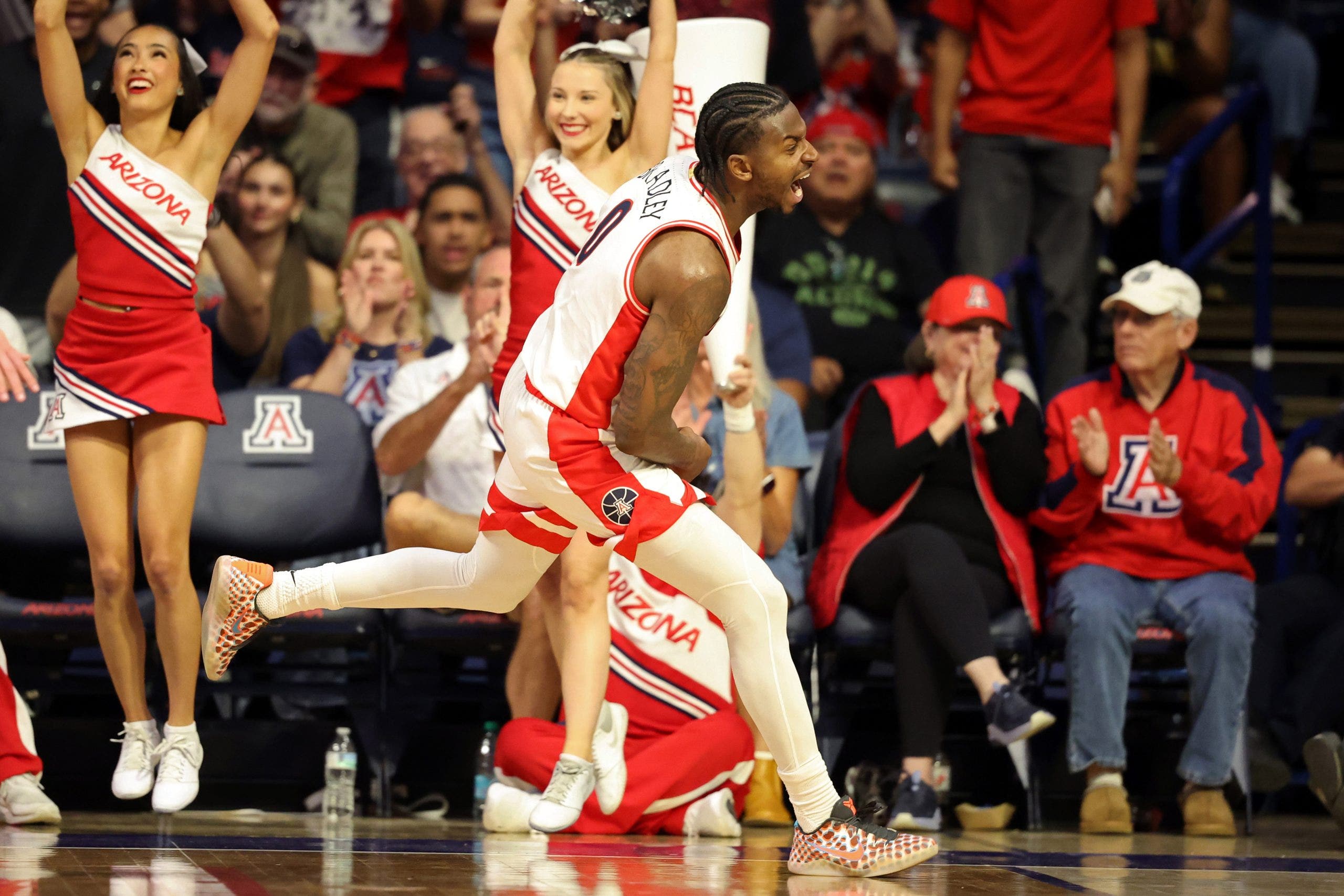 Jaden Bradley #0 of the Arizona Wildcats reacts after scoring a basket against the Oklahoma State Cowboys. (Photo by Chris Coduto/Getty Images)