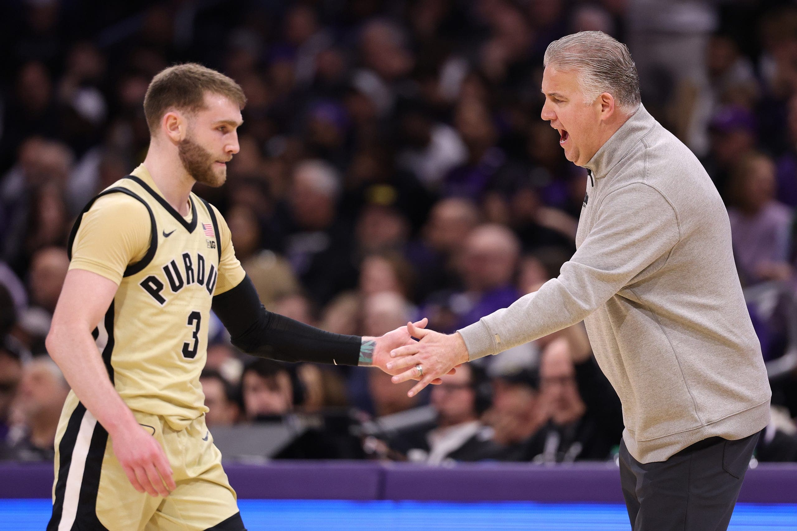 Purdue head coach Matt Painter high-fives Braden Smith against the Northwestern Wildcats. (Photo by Michael Reaves/Getty Images)