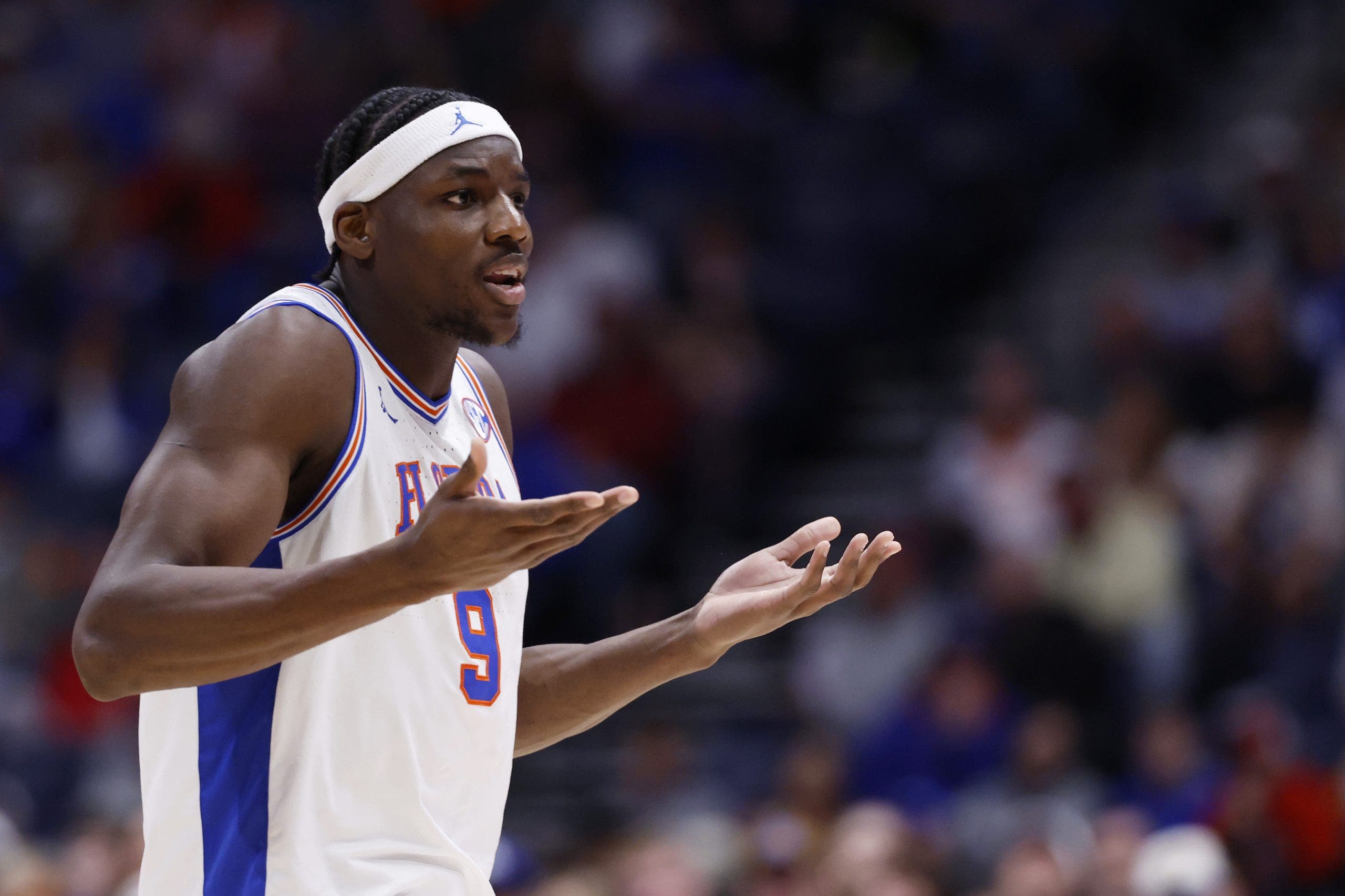 Rueben Chinyelu #9 of the Florida Gators reacts to a play in the third round of the 2026 SEC Men’s Basketball Tournament. (Photo by Johnnie Izquierdo/Getty Images)