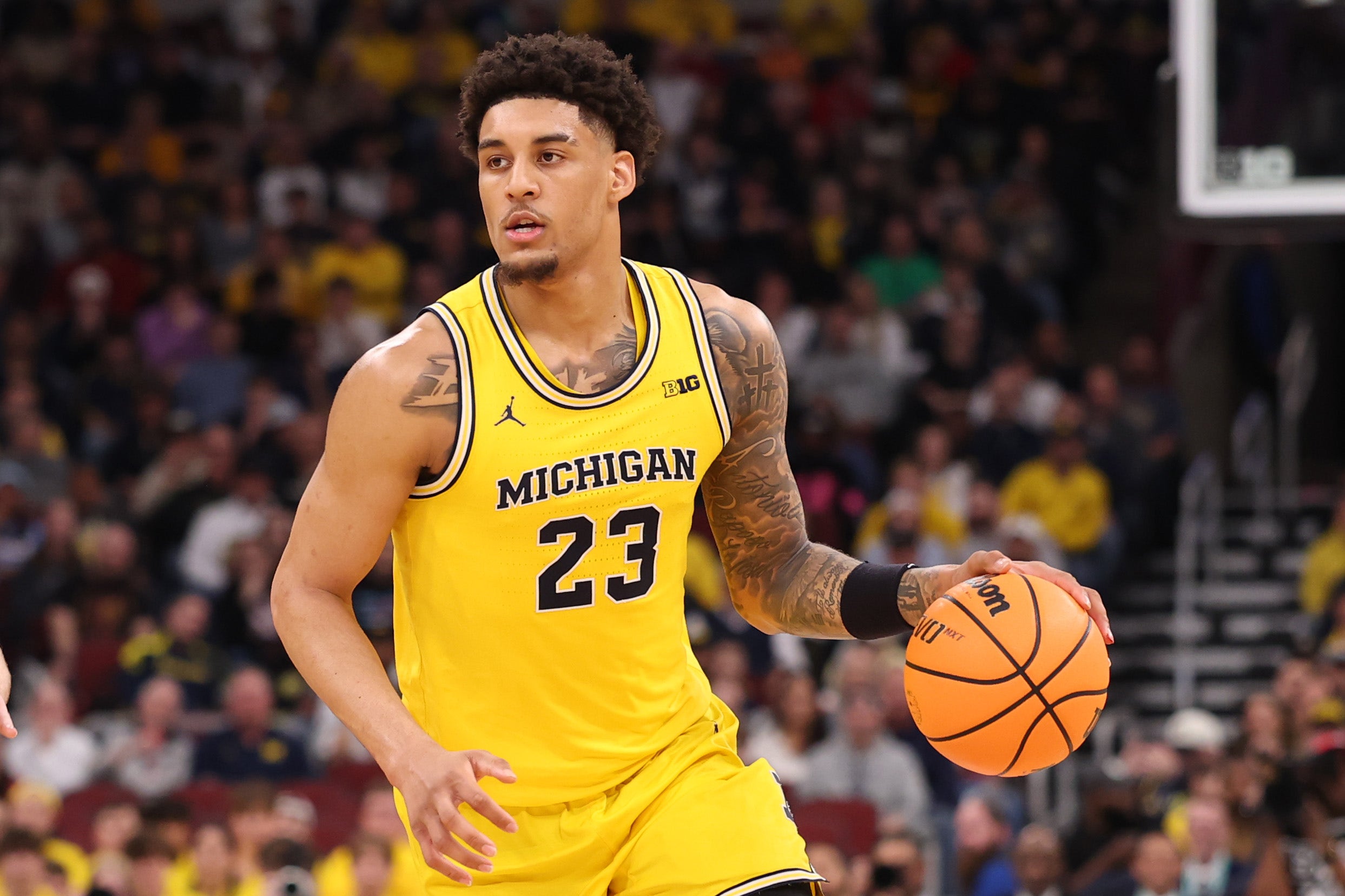 Yaxel Lendeborg #23 of the Michigan Wolverines dribbles against the Purdue Boilermakers. (Photo by Michael Reaves/Getty Images)
