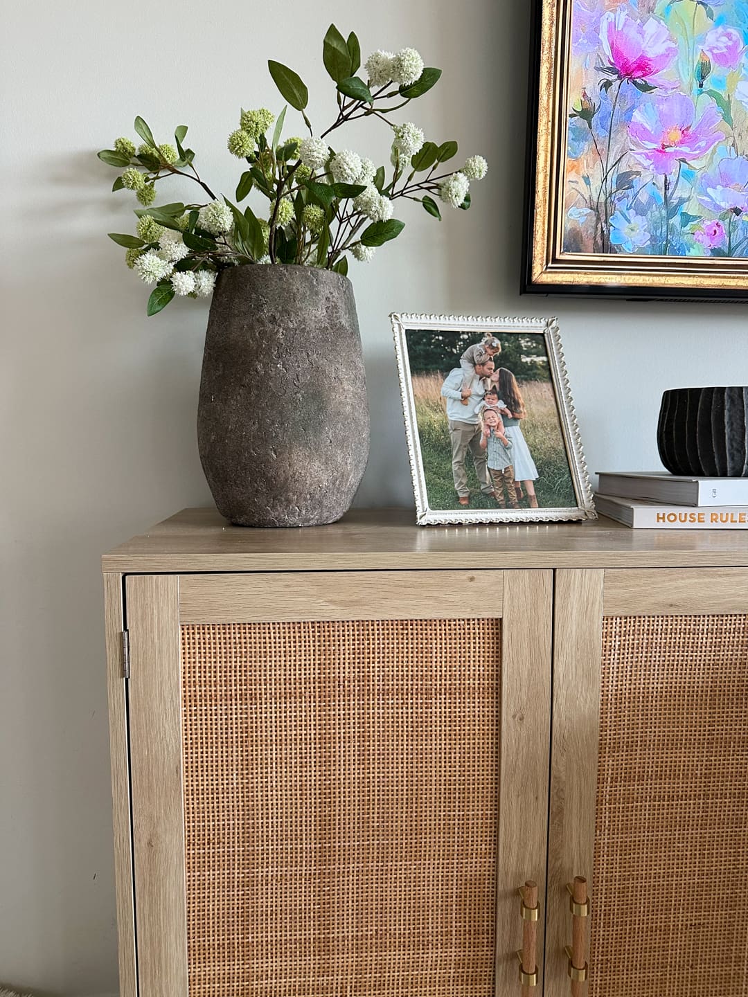 Framed Floral Print // Bunny Figurine // Blue Candle