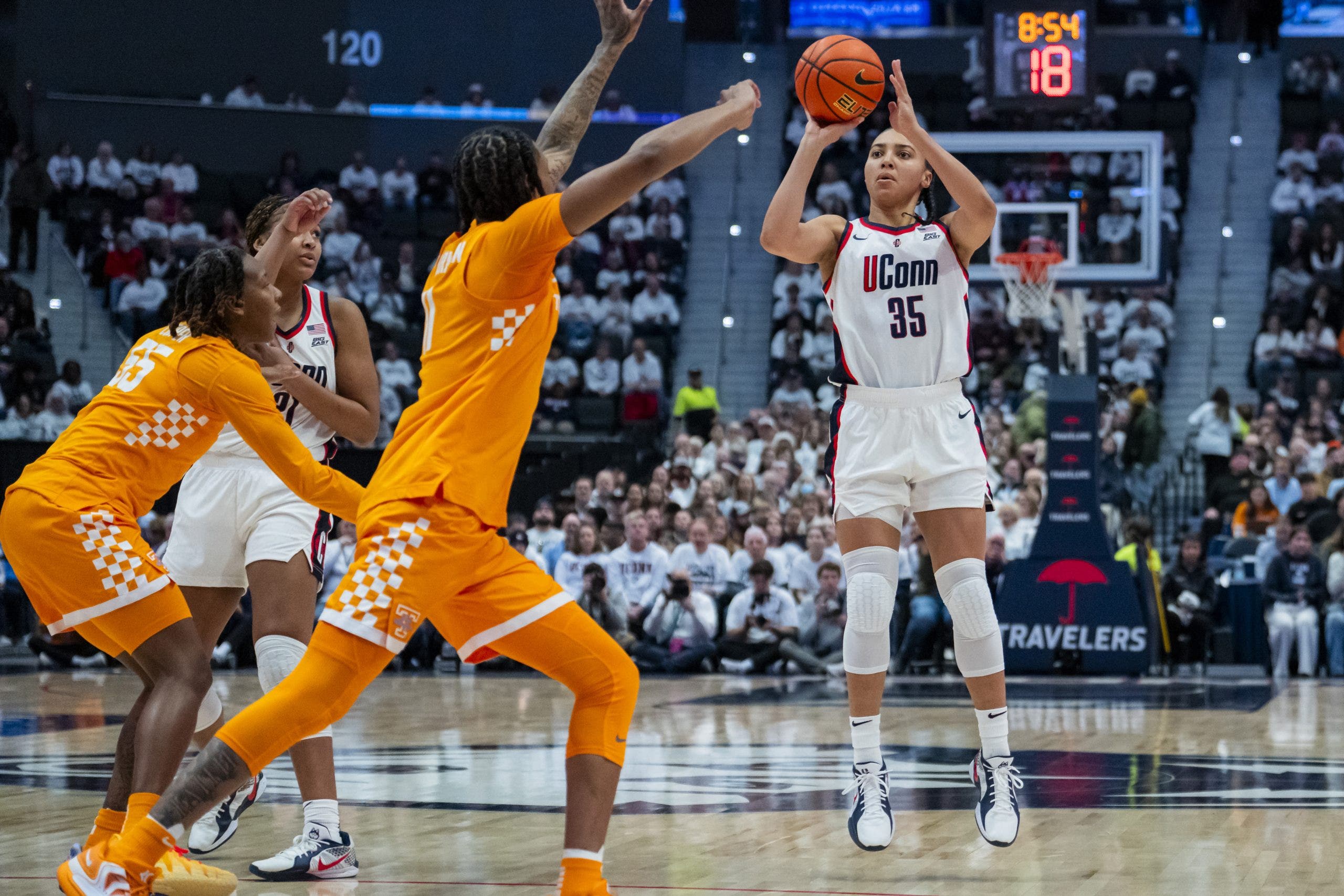 HARTFORD, CONNECTICUT: UConn’s Azzi Fudd shoots against the Tennessee Volunteers on February 01, 2026. (Photo by Joe Buglewicz/Getty Images)